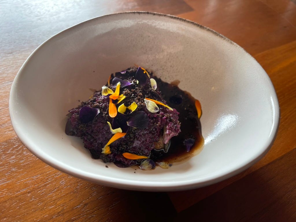 Purple pork in dark sauce, scattered with petals. You see the forest floor before you taste it. Nothing exists in isolation. The mushrooms appear because of the rain. The lupinus flowers shade the forest floor. The dish arrives as a system, not a collection of ingredients.