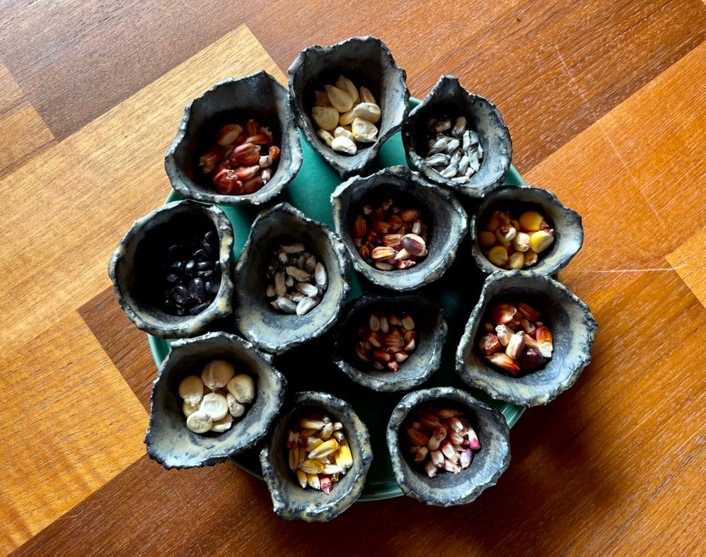 Twelve varieties of corn, each in its own hand-formed vessel. No two the same color, size, or shape. All from the same narrow corridor of land. This isn't agricultural output. It's thousands of harvests made visible, each one a communal act of selection and care.
