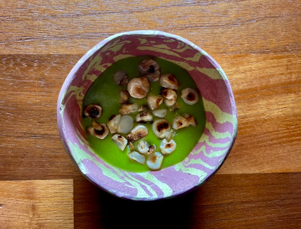 A bright green broth, toasted kernels scattered across the surface. One of several corn dishes that moved through the meal, each from a different variety, each with its own texture and depth. The diversity that looked so striking in those raw vessels became something quieter on the plate. Subtler. But unmistakably varied.