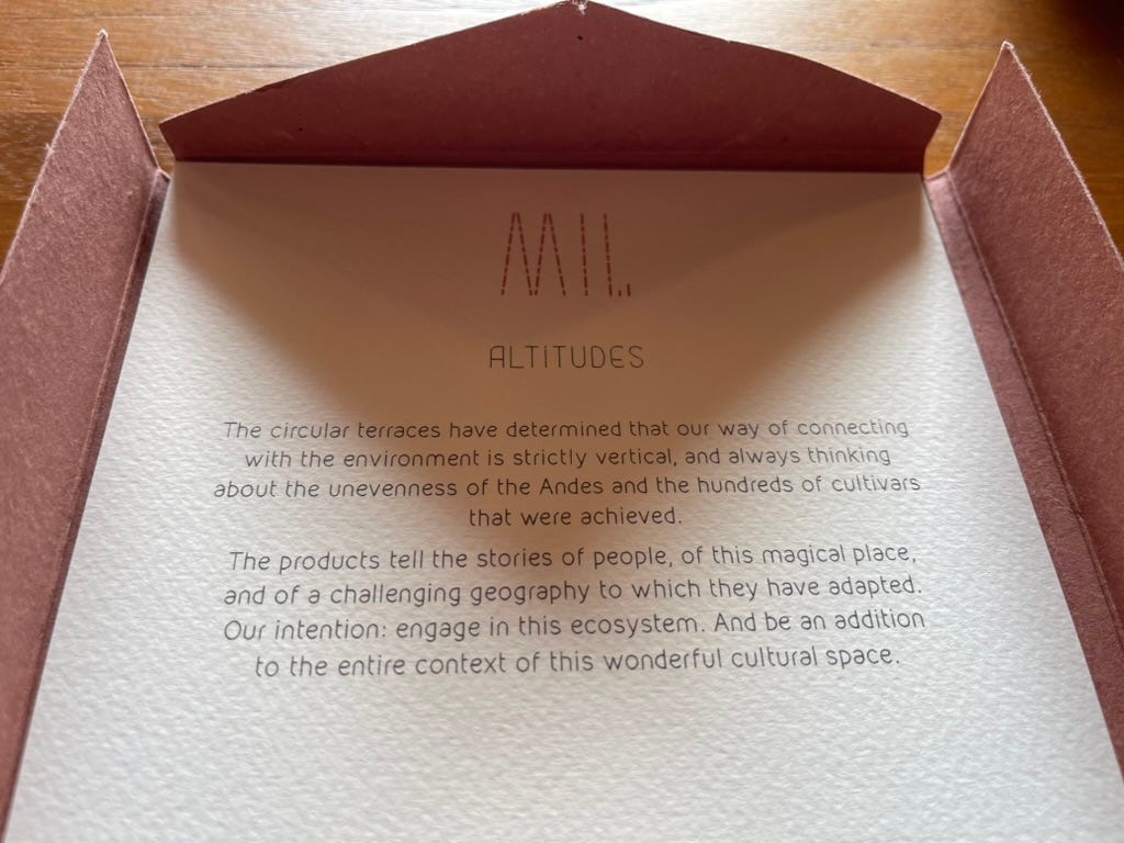 The card reads: “When you look towards the peaks of the mountain gods (Apus) from where we are, you can’t help but imagine yourself in that place, at a temperature below zero, in which one and several decided to settle, despite its challenges. Higher than 11,500 ft (3,500 meters), accompanied by wilderness that resists and what ancestors tamed with extreme skill.”
