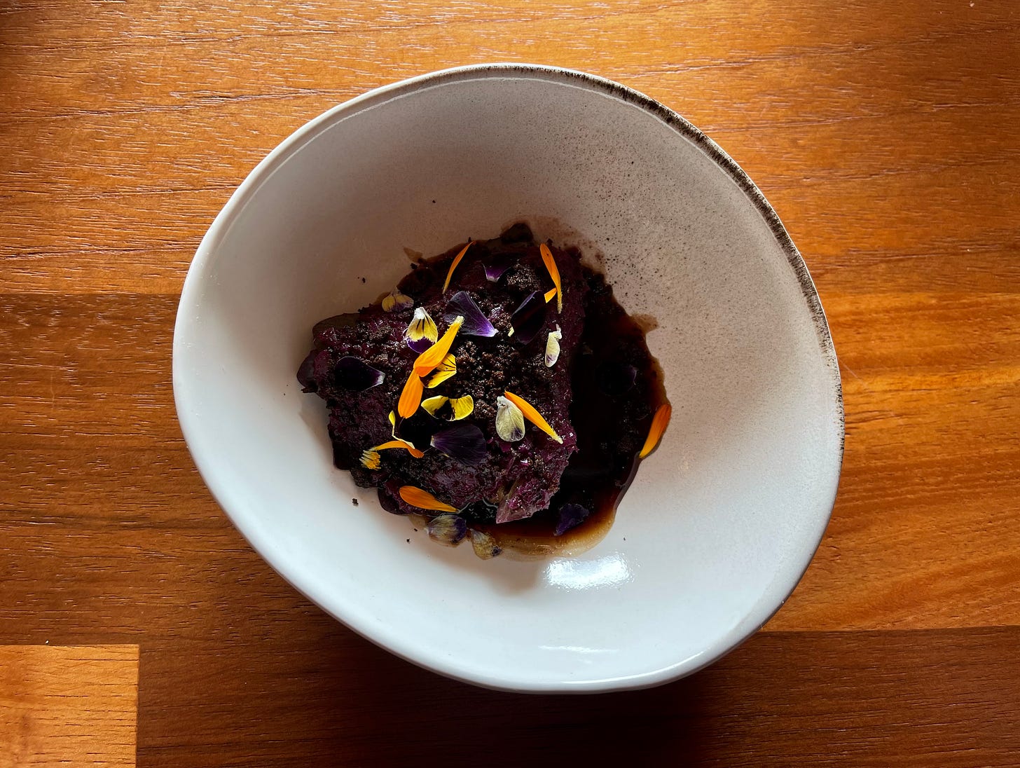 Pork from the forest course, scattered with petals. The deep purple comes from reduction, not dye.