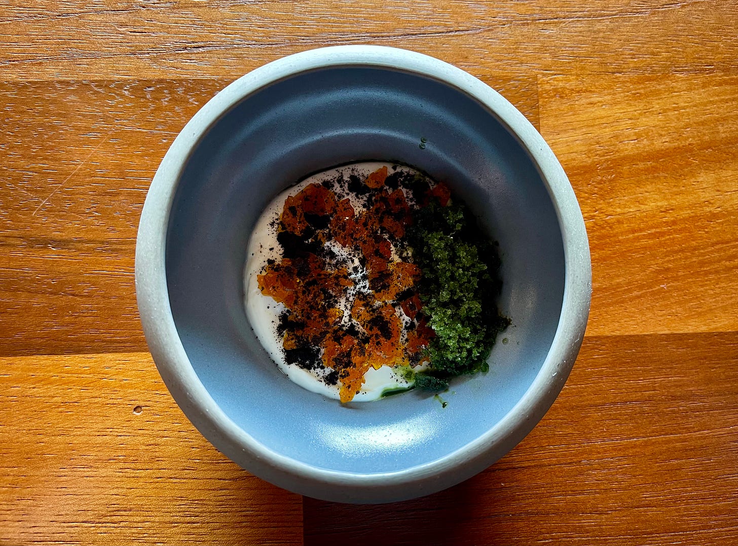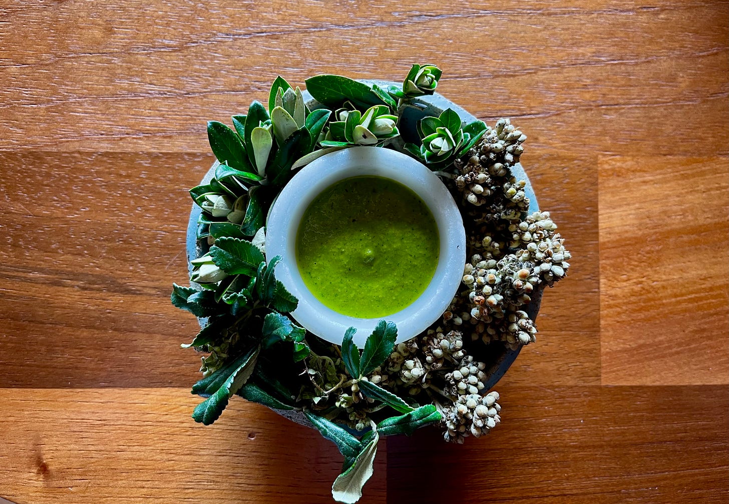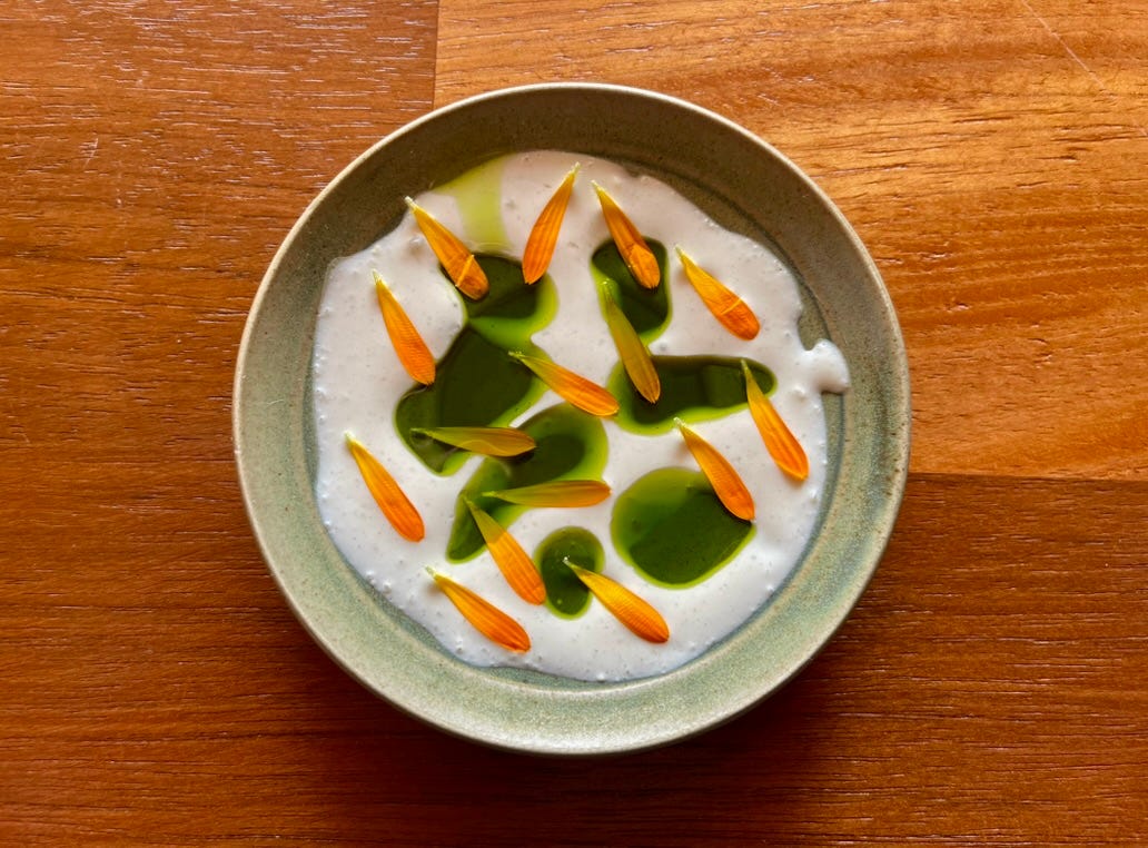 Creamy, cool, scattered with petals. The green pools are herb oil made from plants growing just outside.