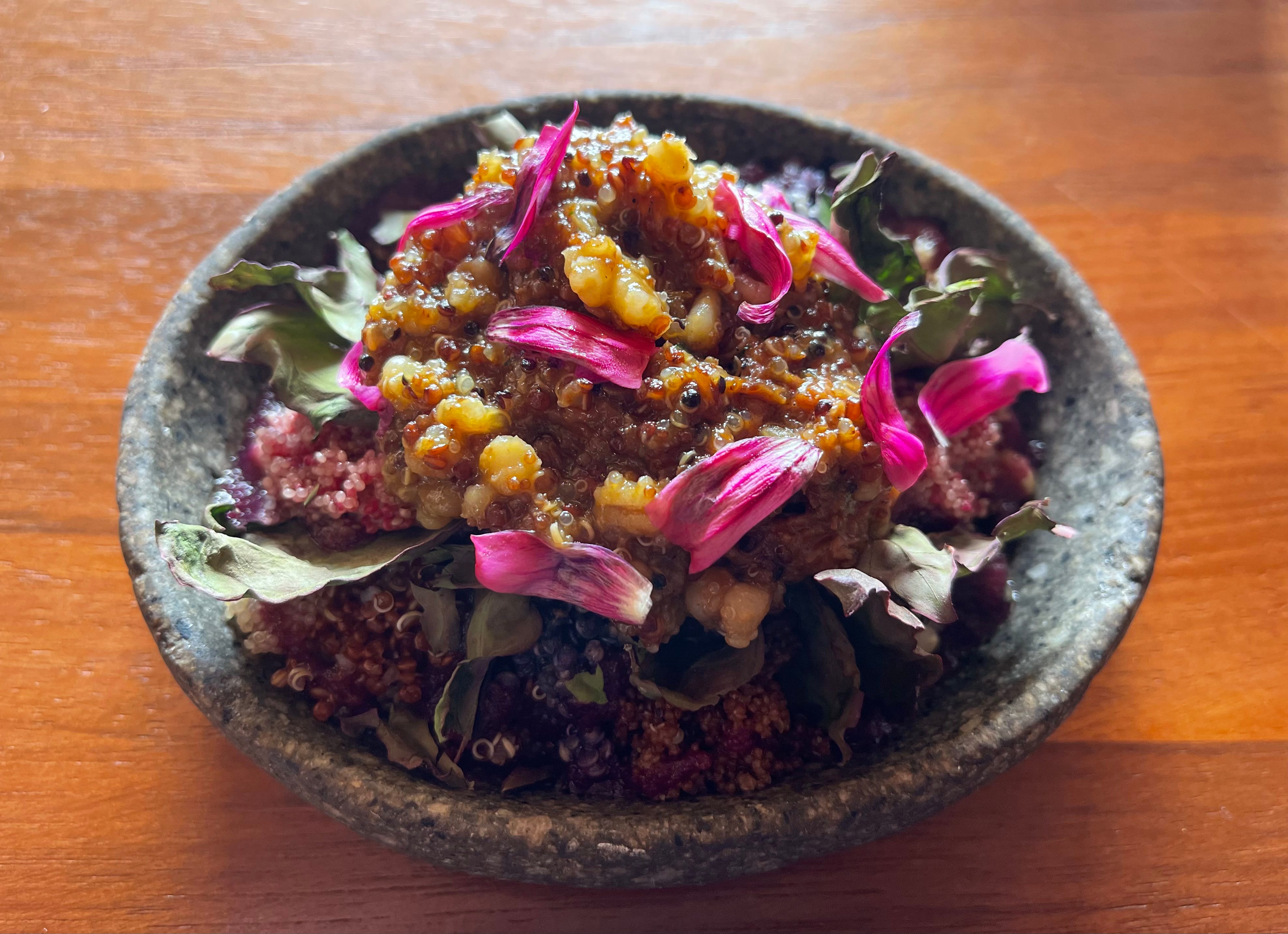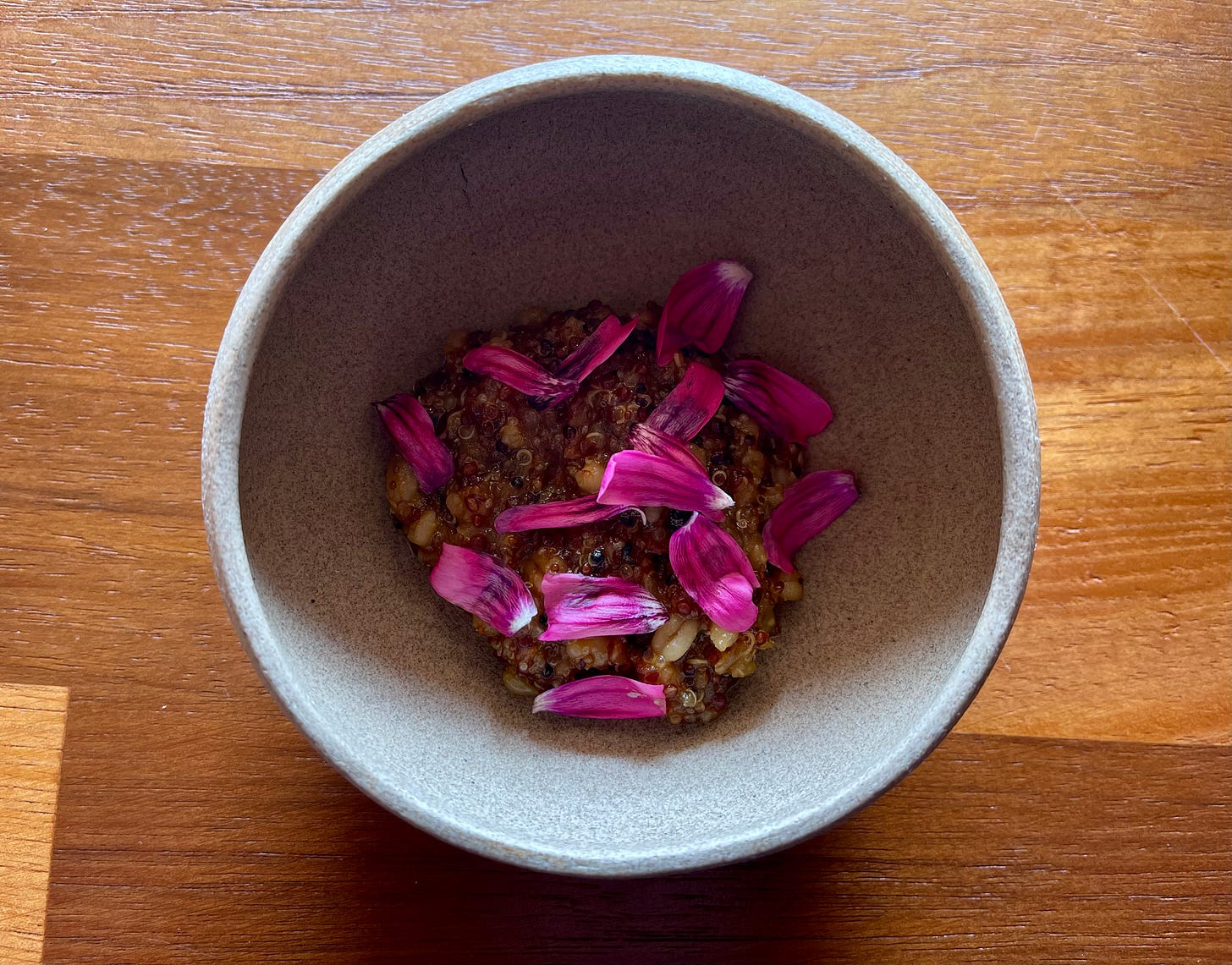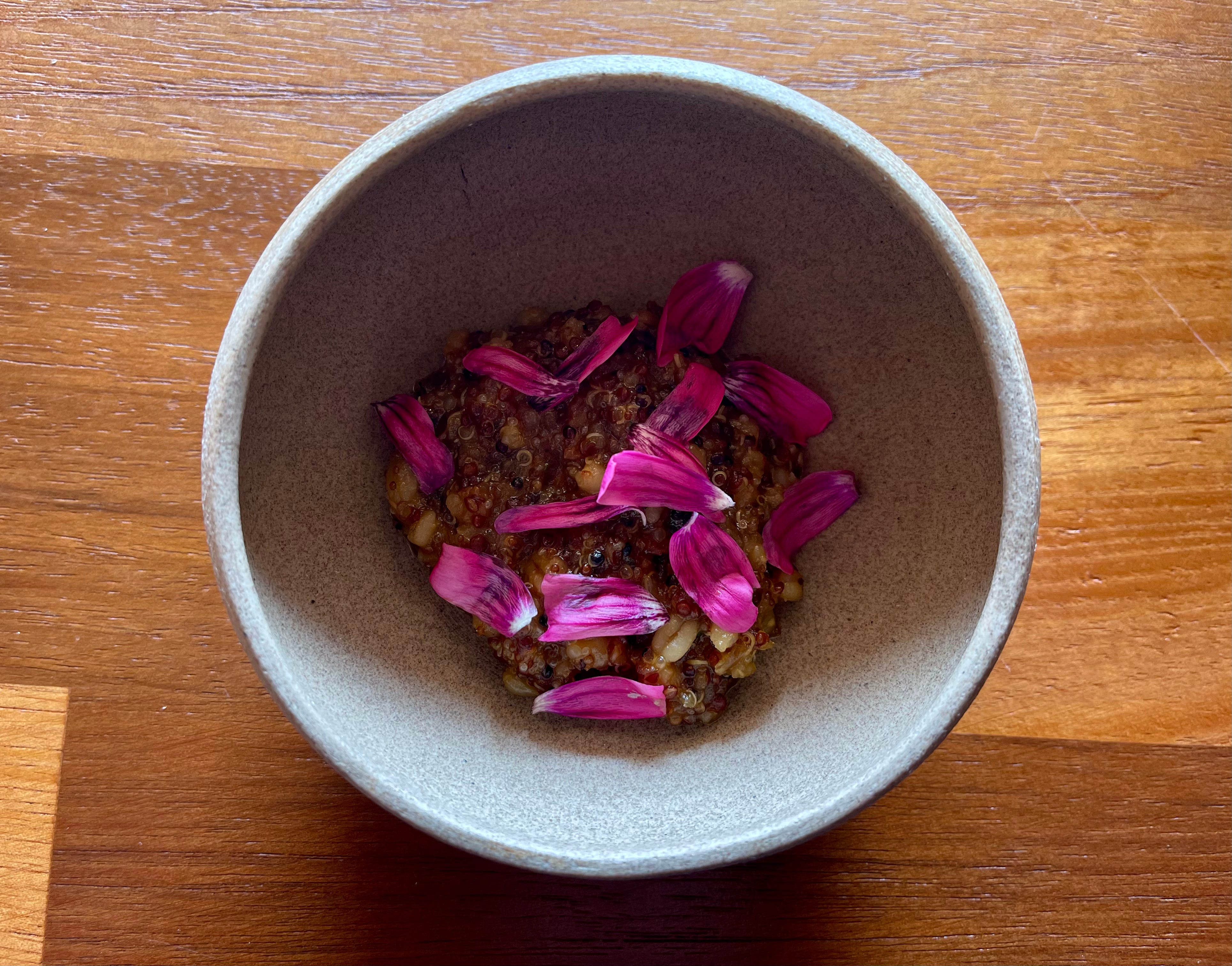 The final preparation in this course. Warmth on top, grain beneath, petals throughout.