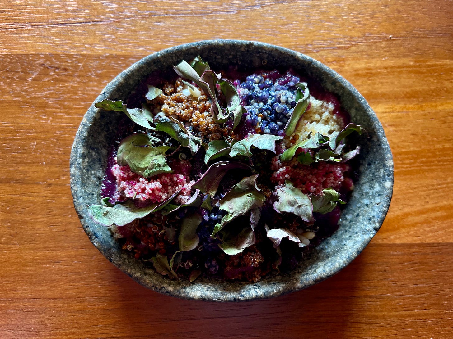 Multiple quinoa varieties in one dish—pink, gold, white, black. Each grown in the valleys nearby.