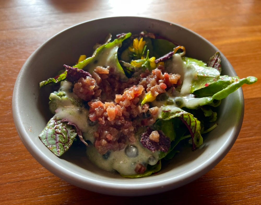 Textures layered: silky cream, tender leaves, the pop of grain. Each component from a different part of the ecosystem.