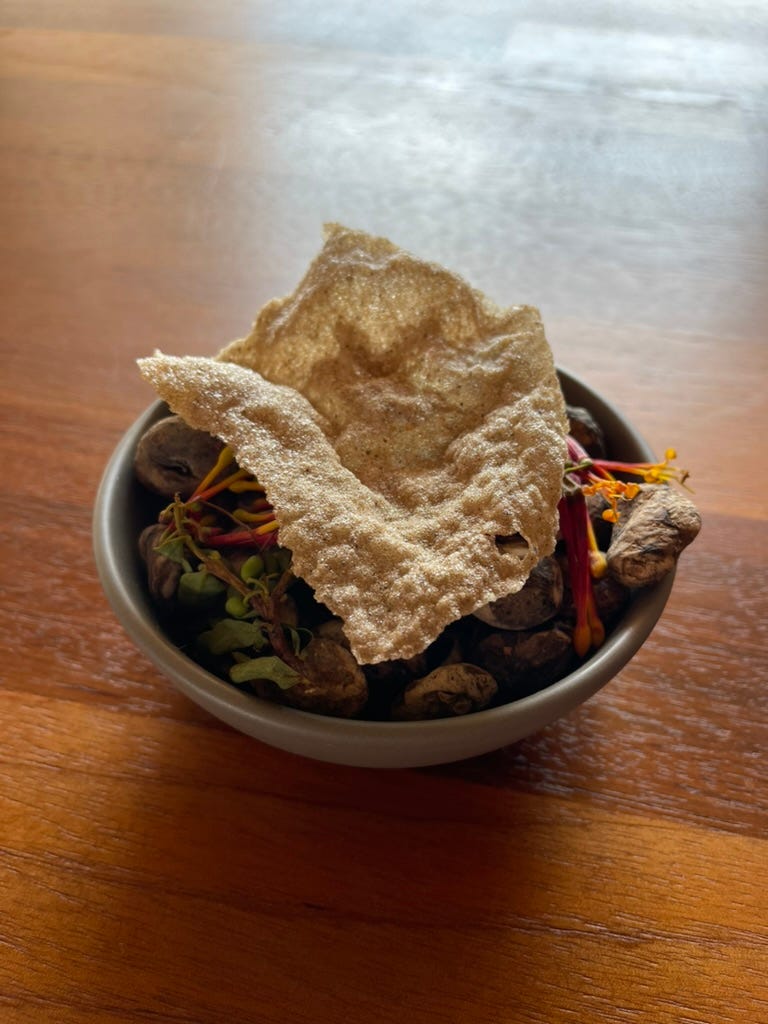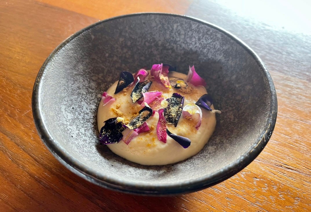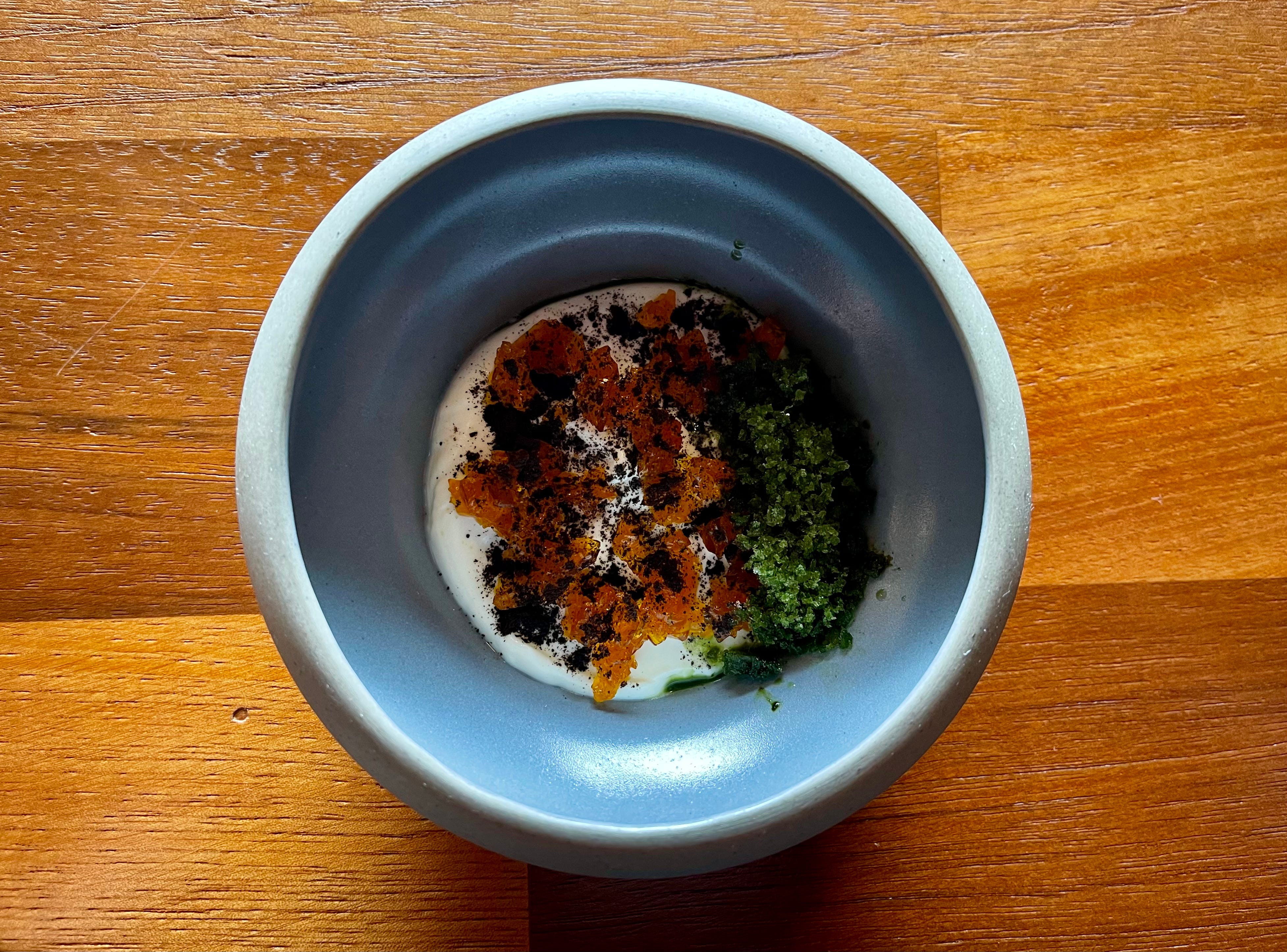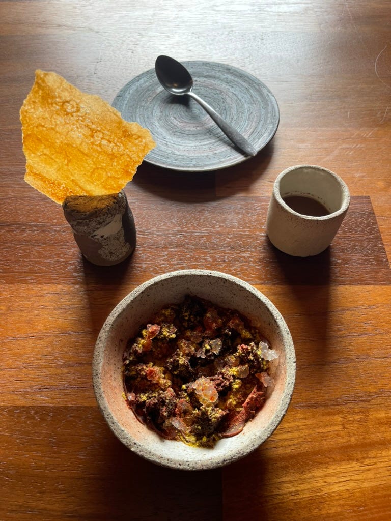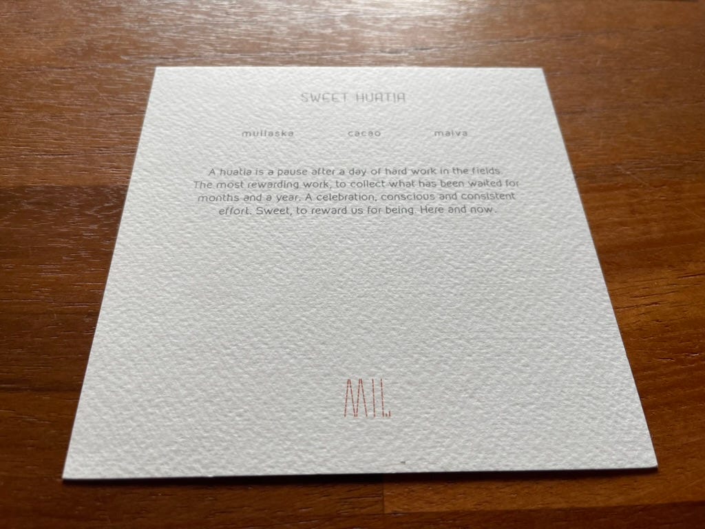 The final course arrives in pieces: a bowl, a crisp, a cup, a spoon. Cacao, mullaska, malva. Each meant to be eaten slowly.