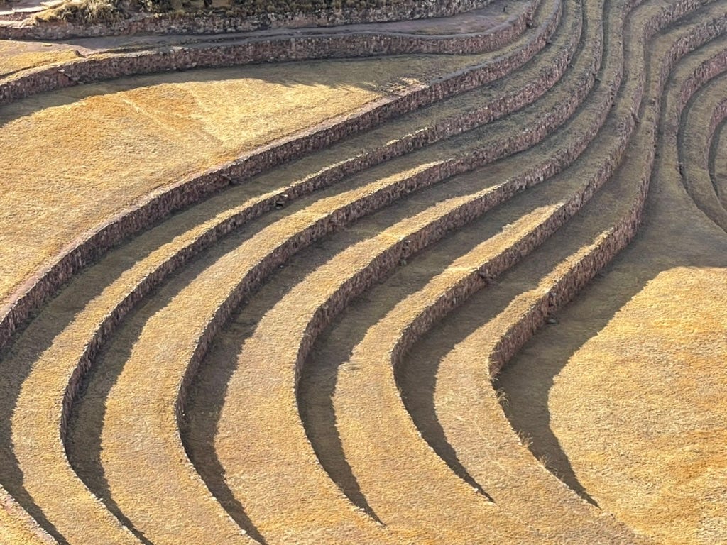 Concentric circular terraces carved into the earth five hundred years ago. An agricultural research station. The temperature difference between top and bottom reaches 27°F, creating twenty distinct microclimates to test which crops would thrive at different altitudes.