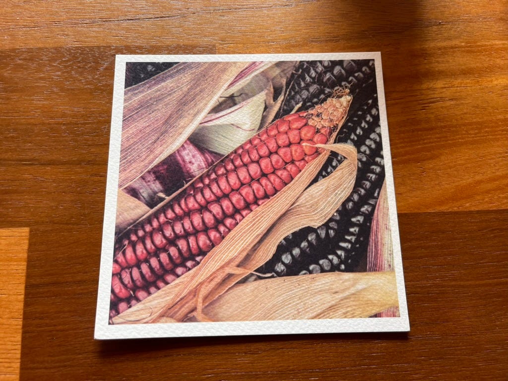 An image of what’s coming: native corn varieties, red and black, still in their husks.