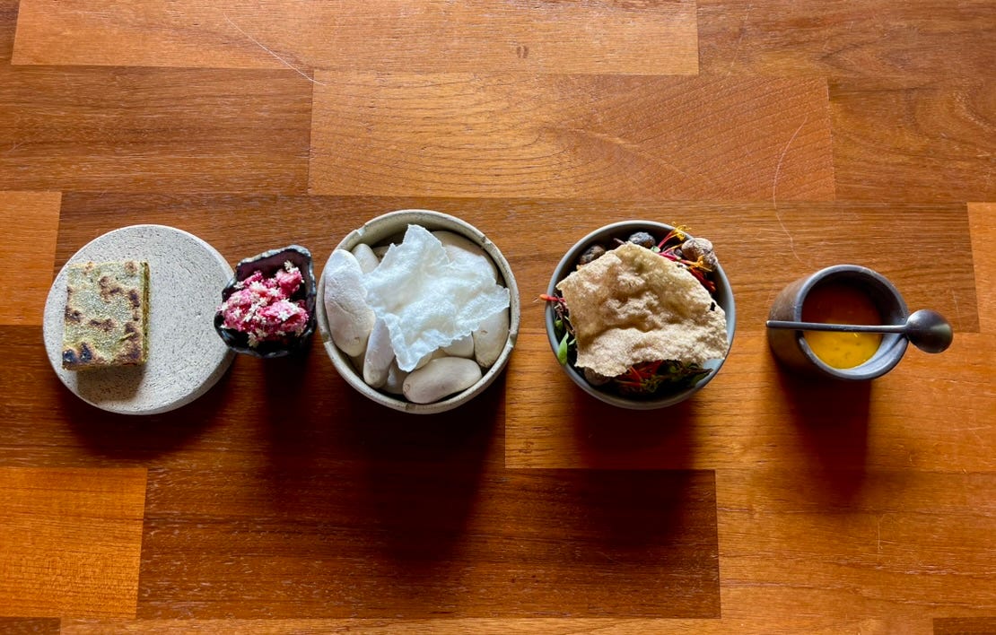 Before the courses begin, small bites arrive. Each plate is handmade ceramic, each garnish foraged from the surrounding hills.