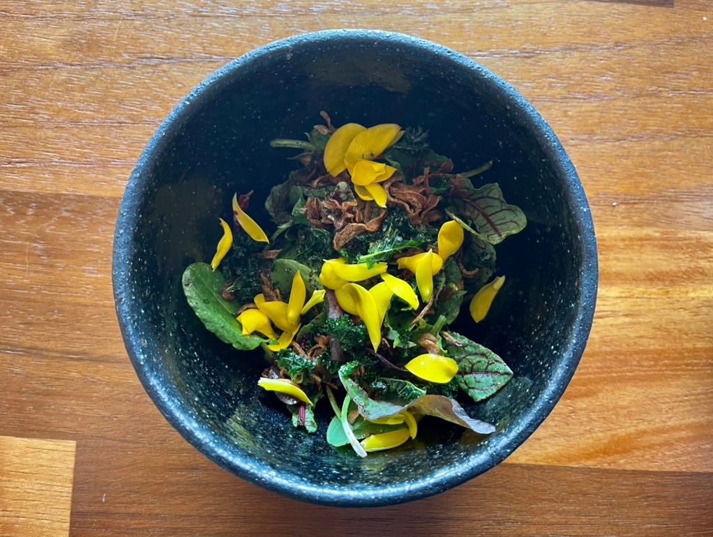 Greens and flowers in a speckled black bowl. The yellow petals aren’t decoration—they’re food.