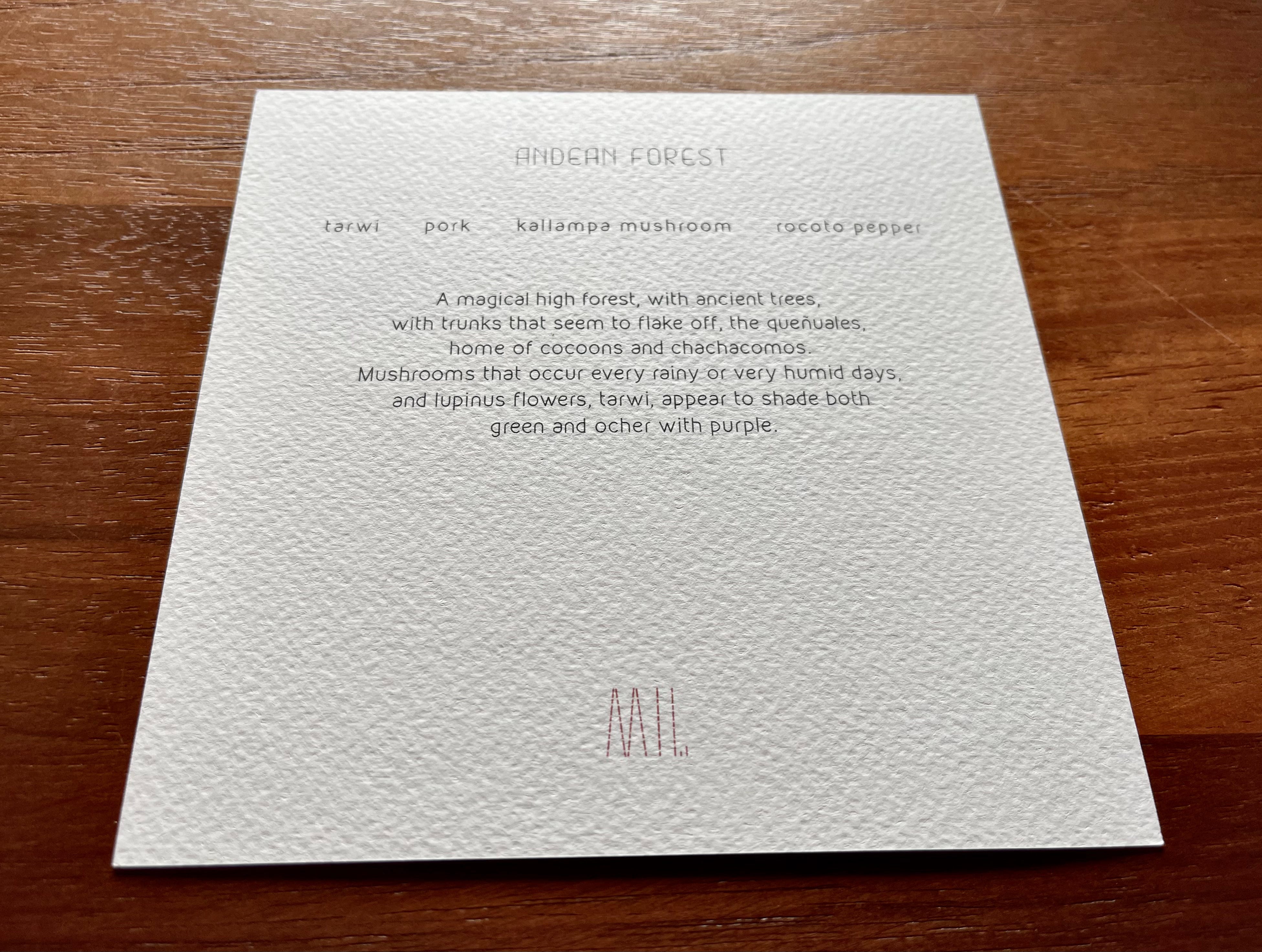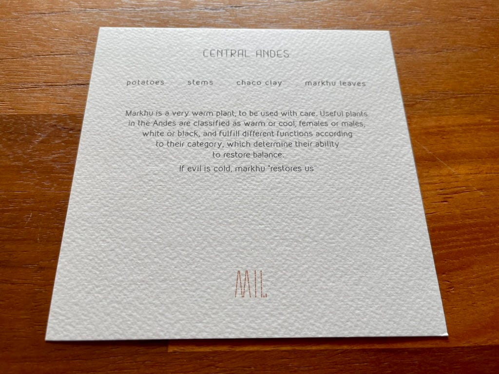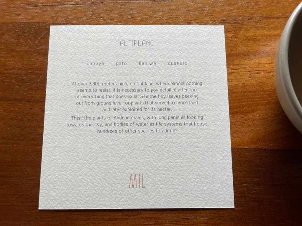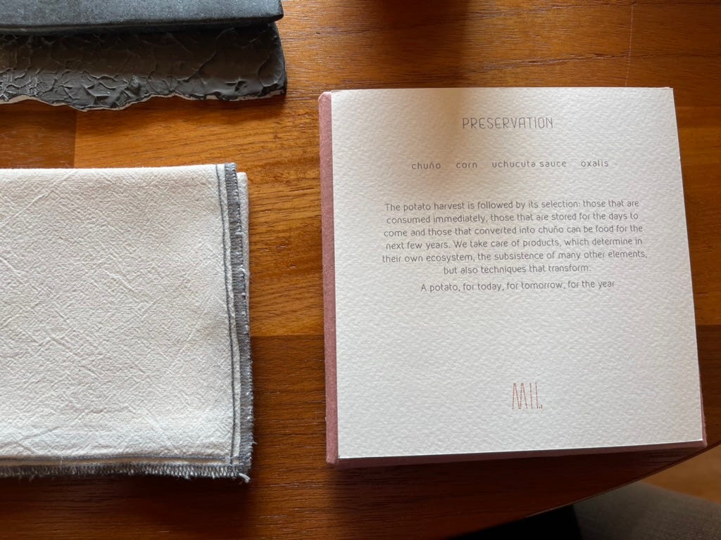 The first card hints at what’s coming: chuño, corn, uchucuta sauce, oxalis. “A potato, for today, for tomorrow, for the year.”