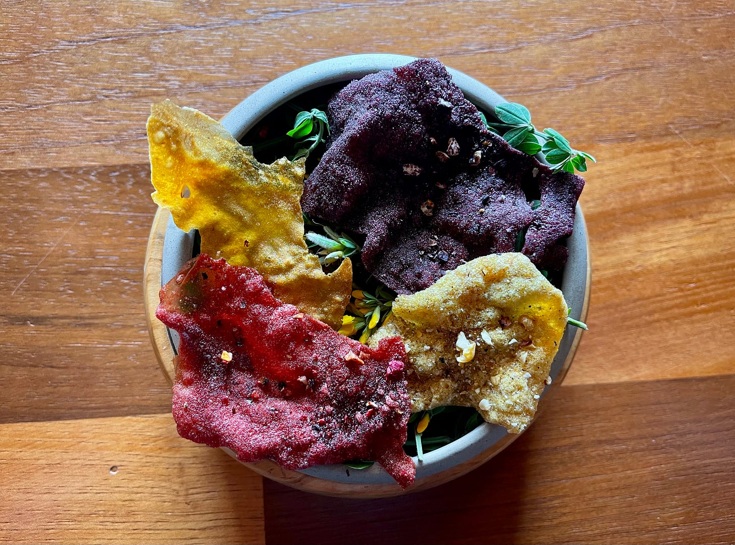 Texture and color. The wafer shatters; the stems beneath are tender. Contrast built into every bite.