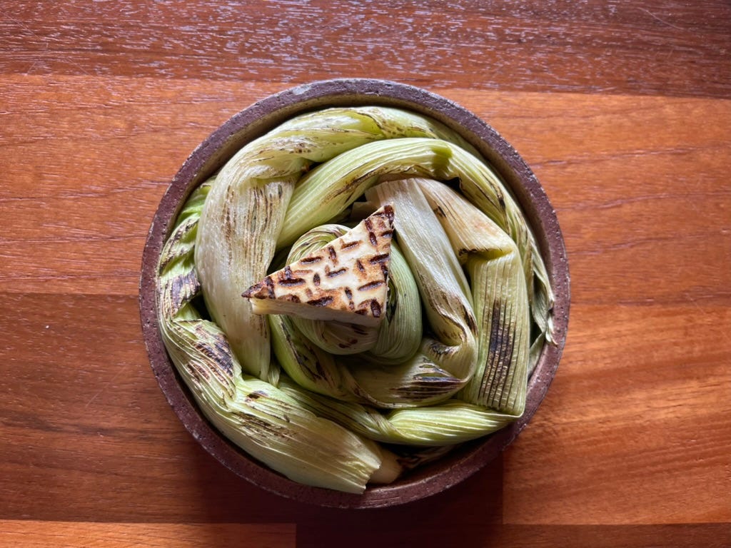 Fresh cheese, grilled and nestled in husks. Simple. The corn that made the dish also presents it.