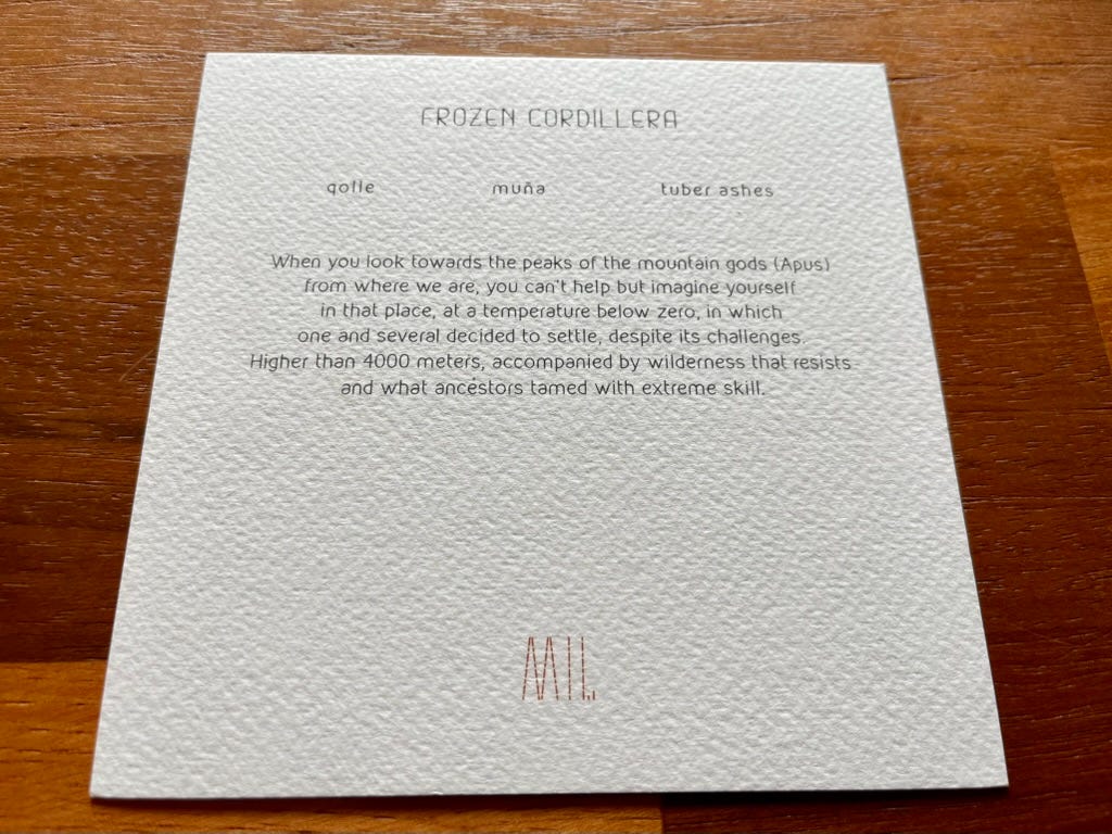 Muña herb, tuber ashes, cream. The flavors of the frozen peaks, translated into dessert.
