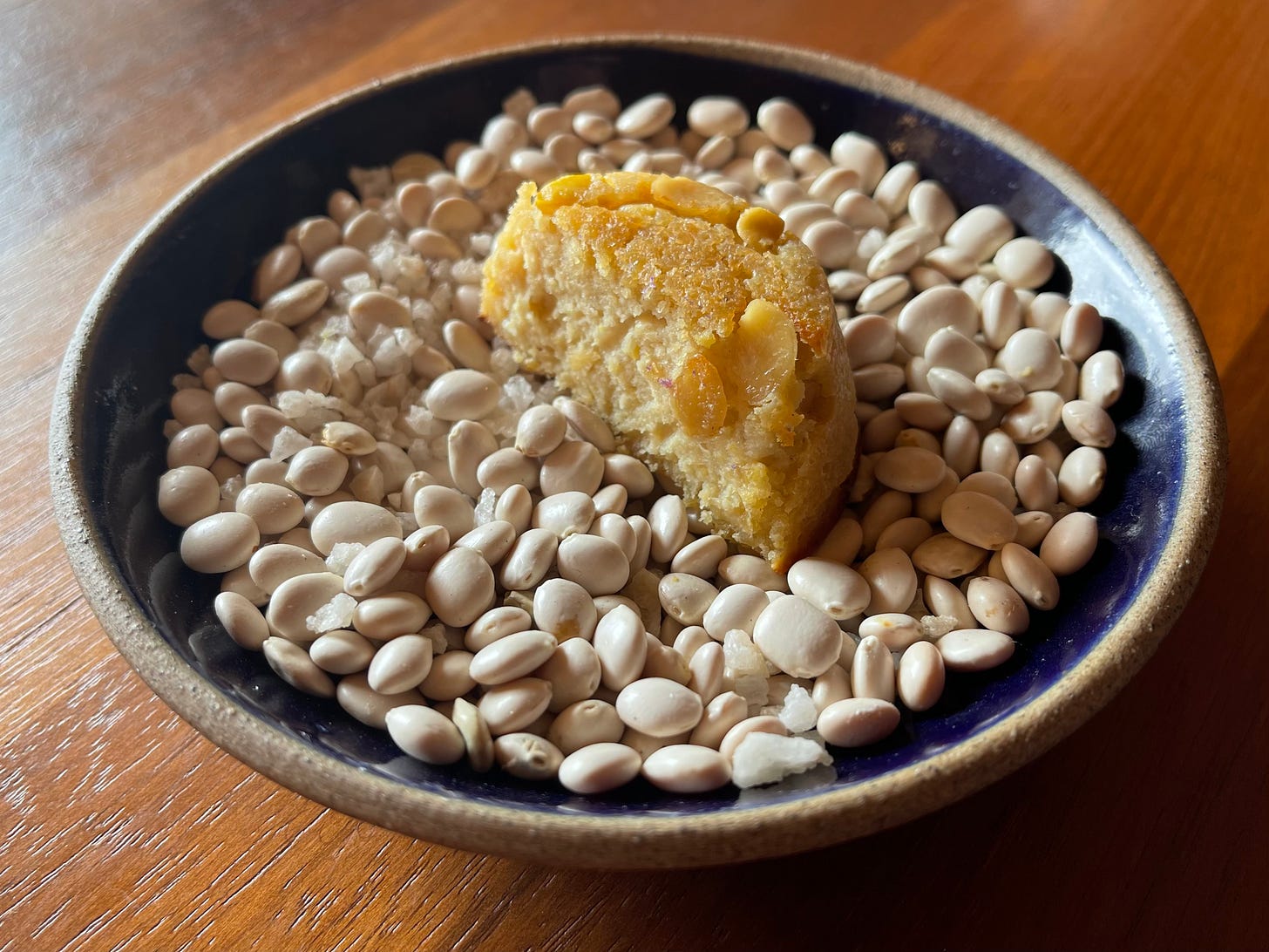 Cornbread resting on a bed of tarwi—an Andean lupin bean, high in protein. The raw ingredient becomes the presentation.