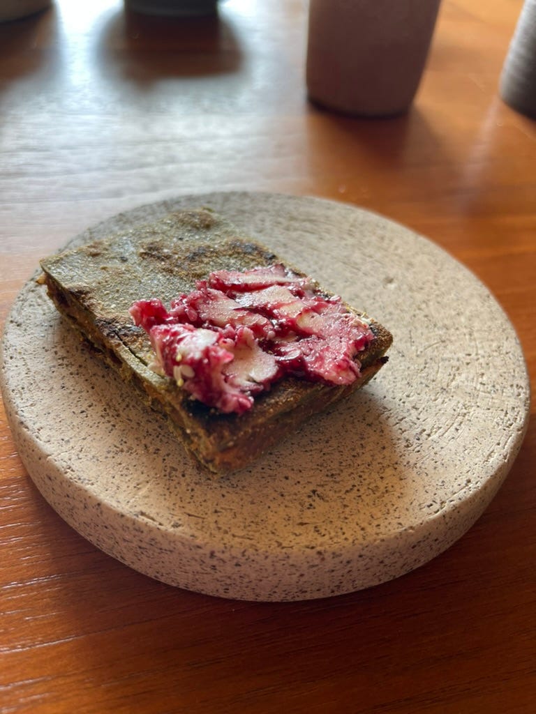 Bread served on stone. The pink comes from local produce—nothing here traveled far.