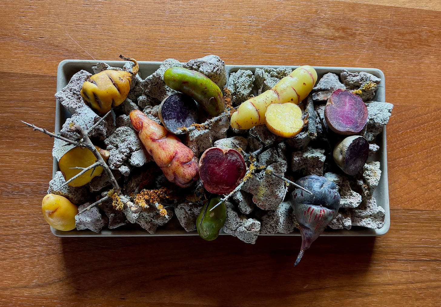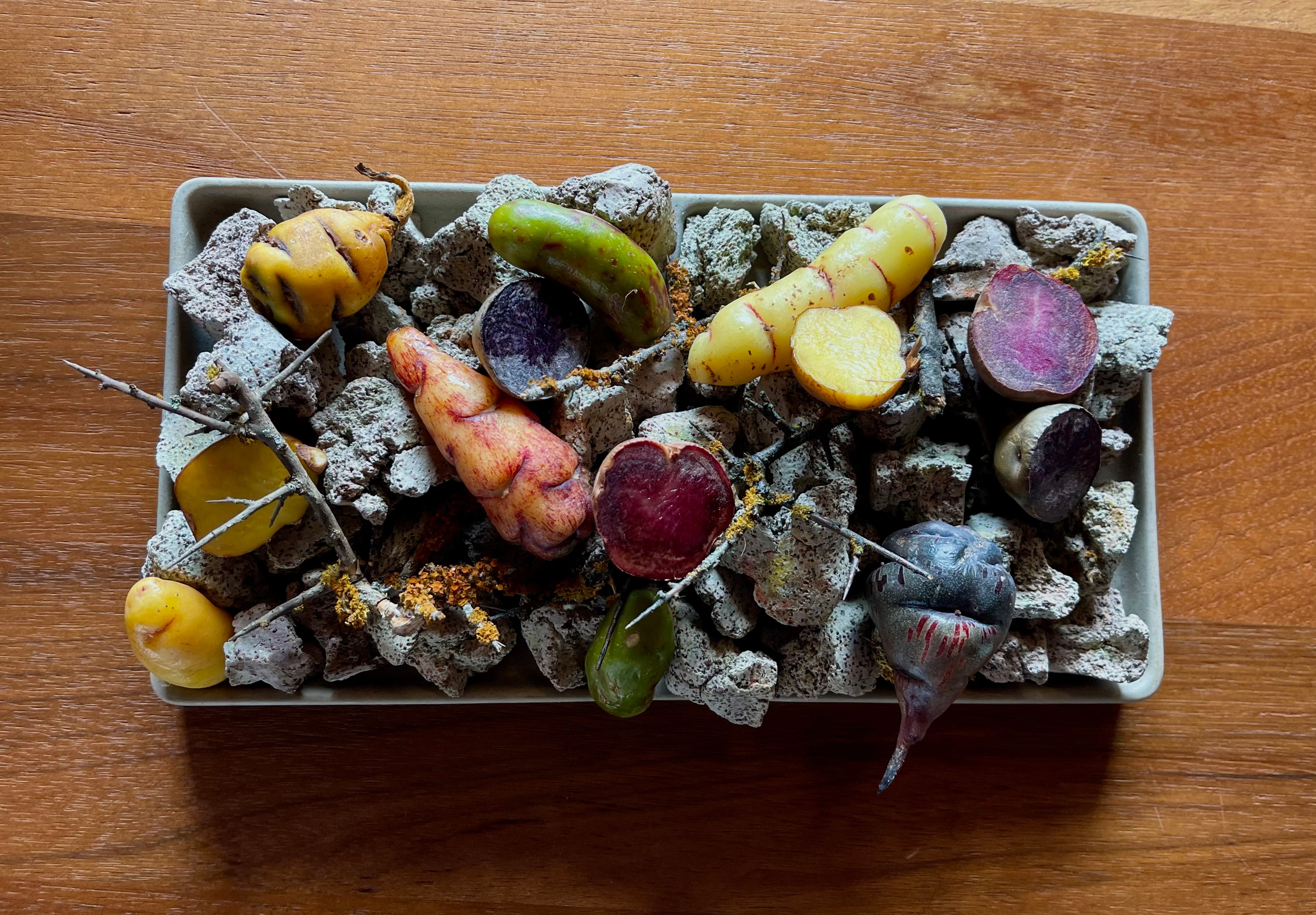 Peru has more than 4,000 native potato varieties. Here, three sit in volcanic rock, looking like they were just unearthed.