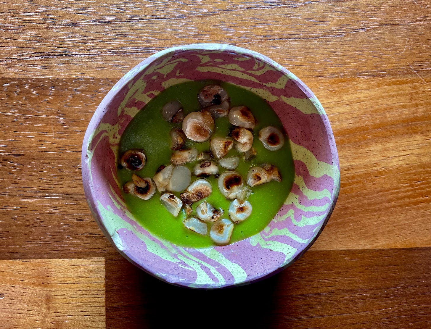 Bright green, studded with toasted corn. The swirled bowl is as striking as what it holds.
